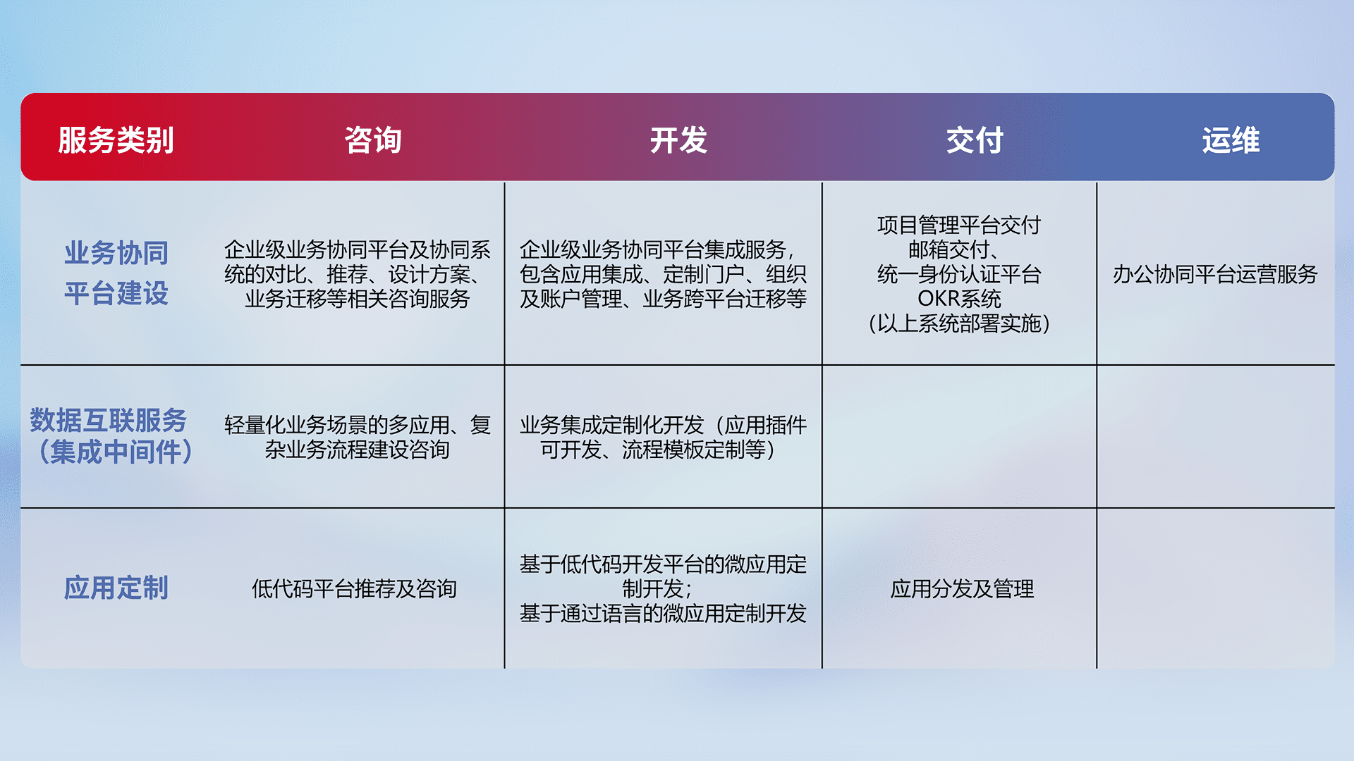 针对钉钉、、企微、、、、IDaas等平台级产品提供产品的规划、、方案、、、、交付、、、、定制化开发等服务,,实现如统一协同办公、、、智能客户服务、、、、混合会议管理、、、智能数据查询、、等业务场景,,实现数字化转型。。